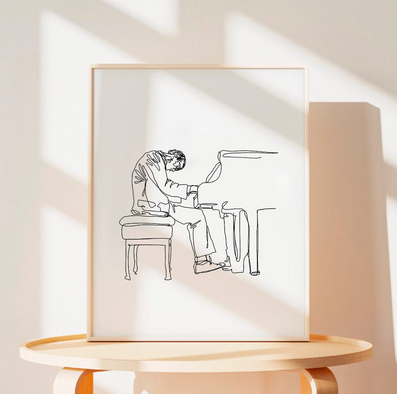 Minimal wall art featuring Bill Evans at his piano, drawn in one continuous line style.