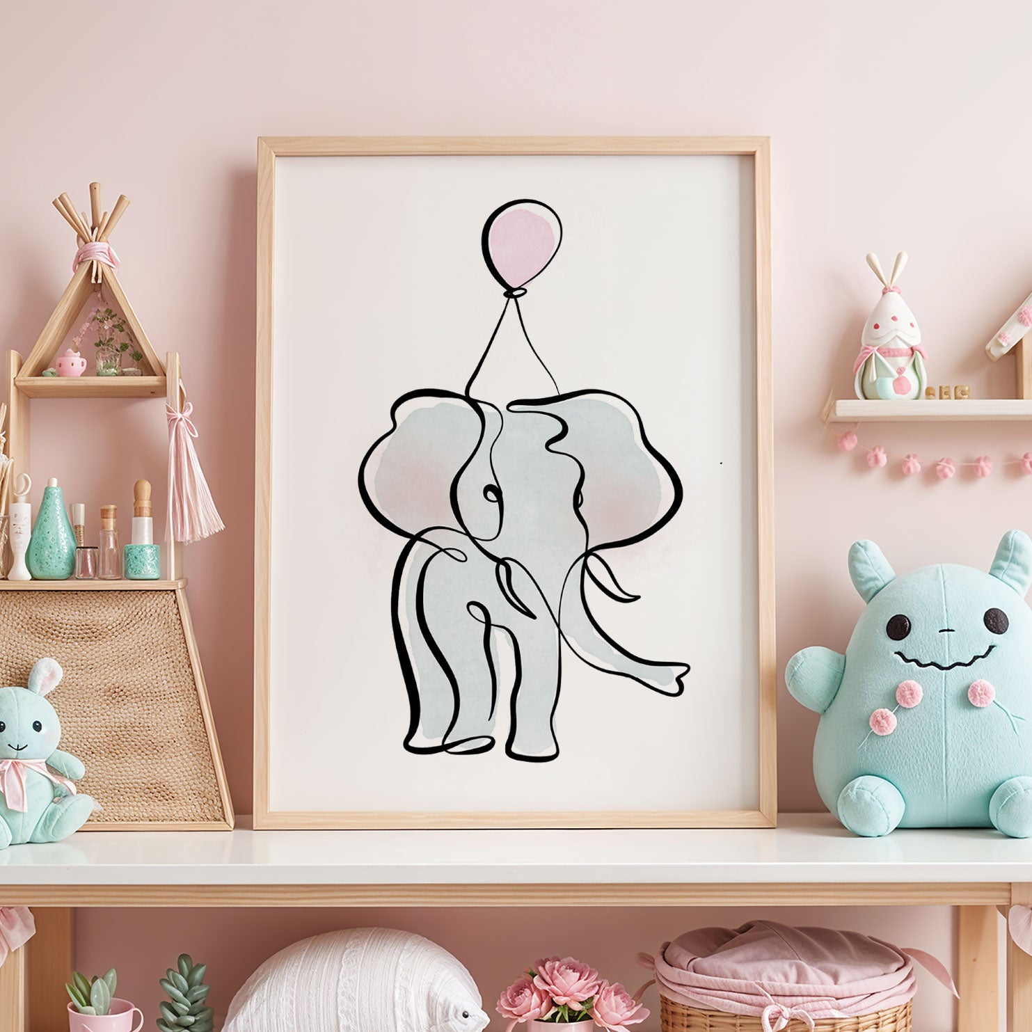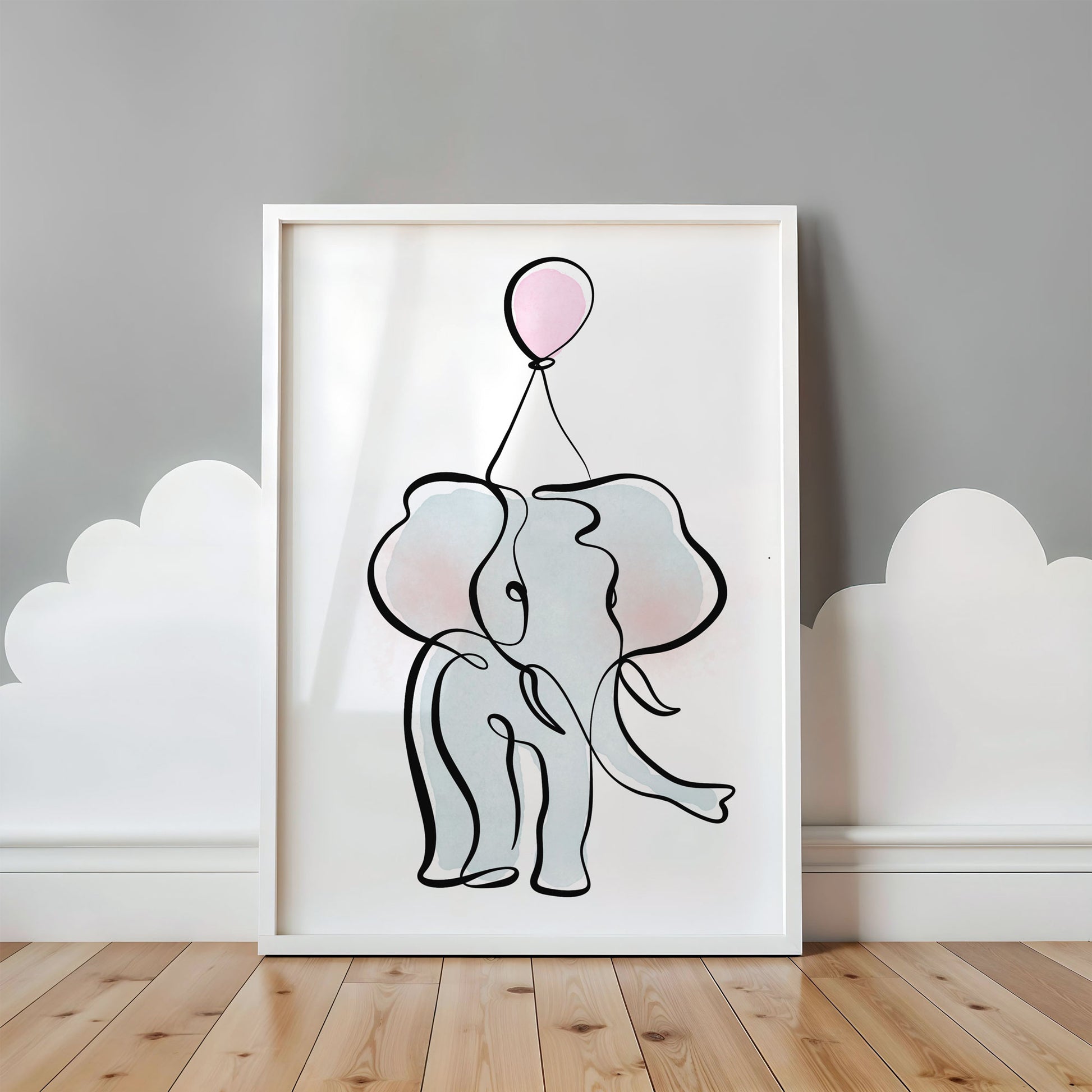A whimsical and minimalist one-line illustration of a baby elephant floating into the sky, carried by a single balloon. Painted in acrylic ink and carefully digitised to preserve the fluid beauty of the original artwork, this print is perfect for nurseries, children’s rooms, or anyone who loves a touch of playfulness in their space.