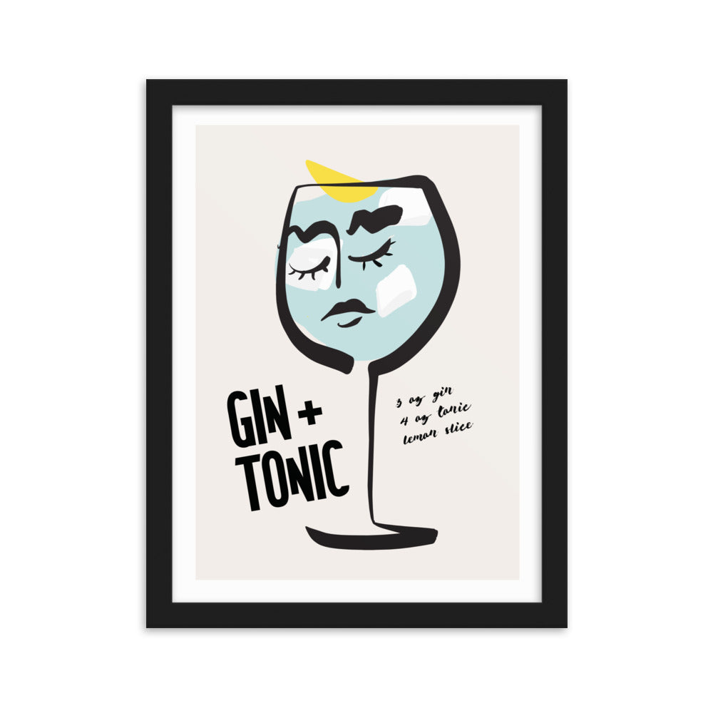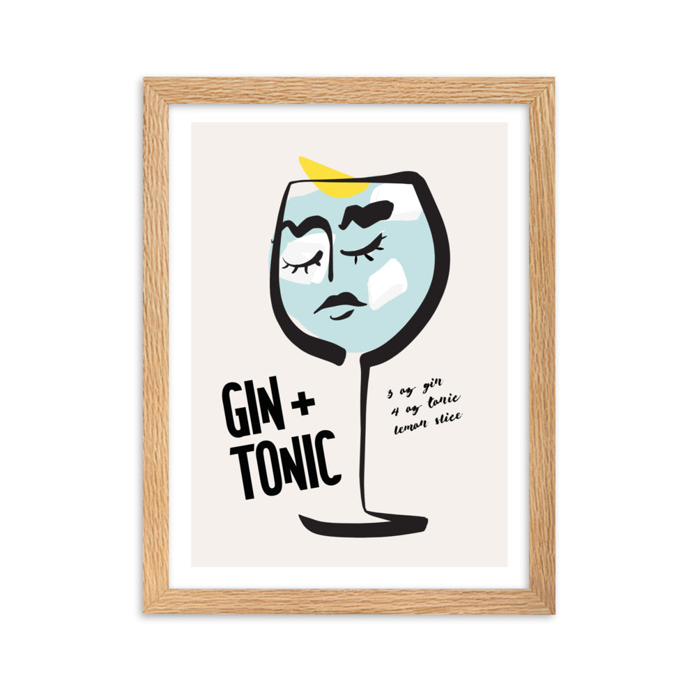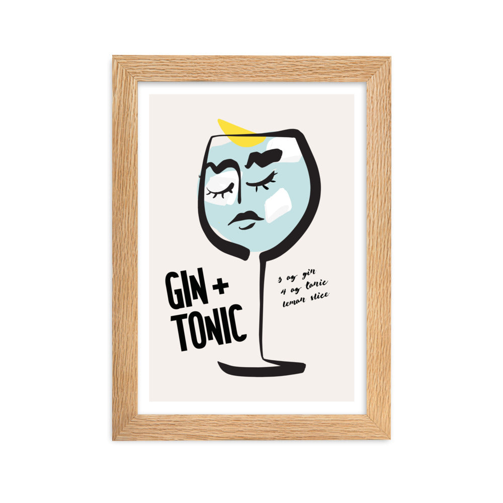 This framed poster features a bold one line drawing of a Gin and Tonic Glass, with a cheeky little face on it. Groovy text reads "Gin + Tonic" and the poster is finished off with a visual of the traditional Gin and Tonic measurements.