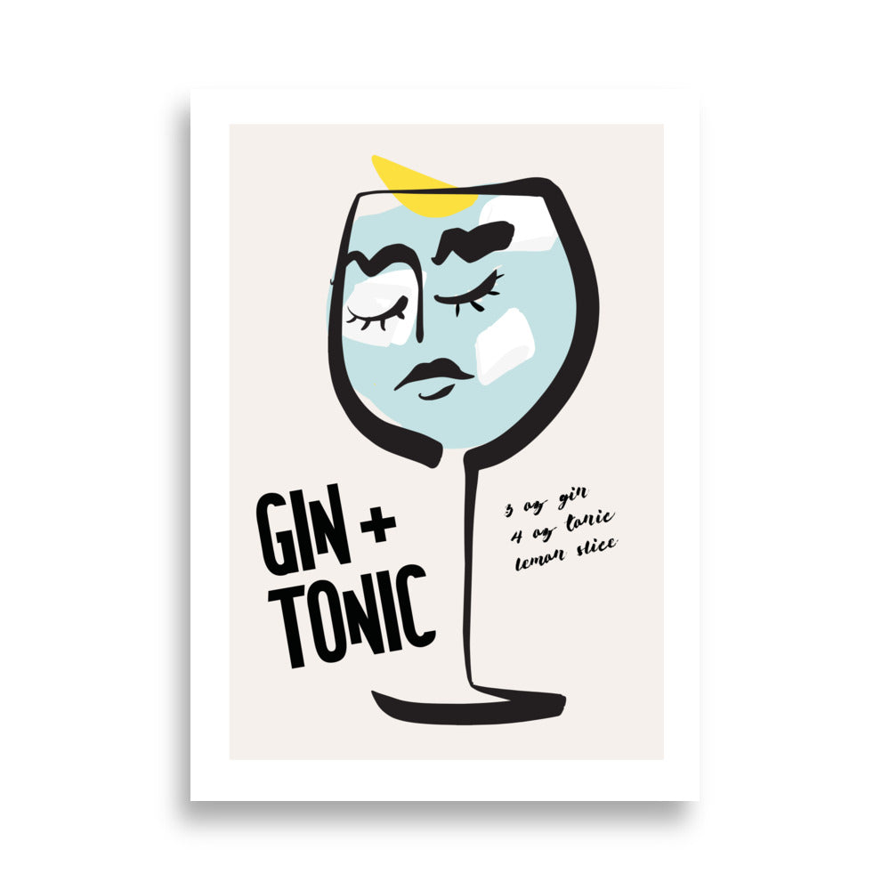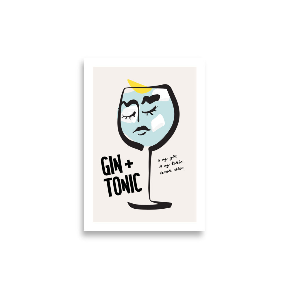 This poster features a bold one line drawing of a Gin and Tonic Glass, with a cheeky little face on it. Groovy text reads "Gin + Tonic" and the poster is finished off with a visual of the traditional Gin and Tonic measurements.