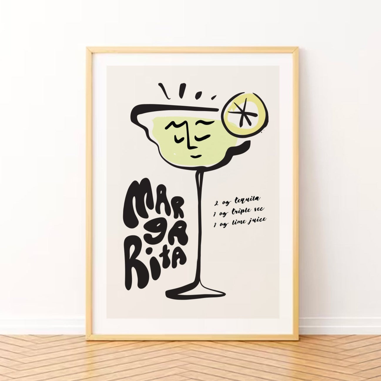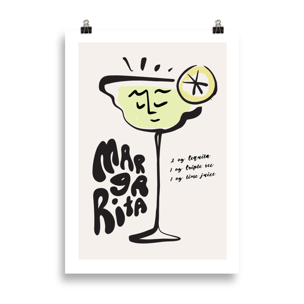 Tequila time! This poster features a bold one line drawing of a Margarita glass, with a cheeky little face on it. Groovy hand drawn text reads "MARGARITA" and the poster is finished off with a visual of the traditional margarita recipe cocktail measurements - tequila, triple sec and lime juice.