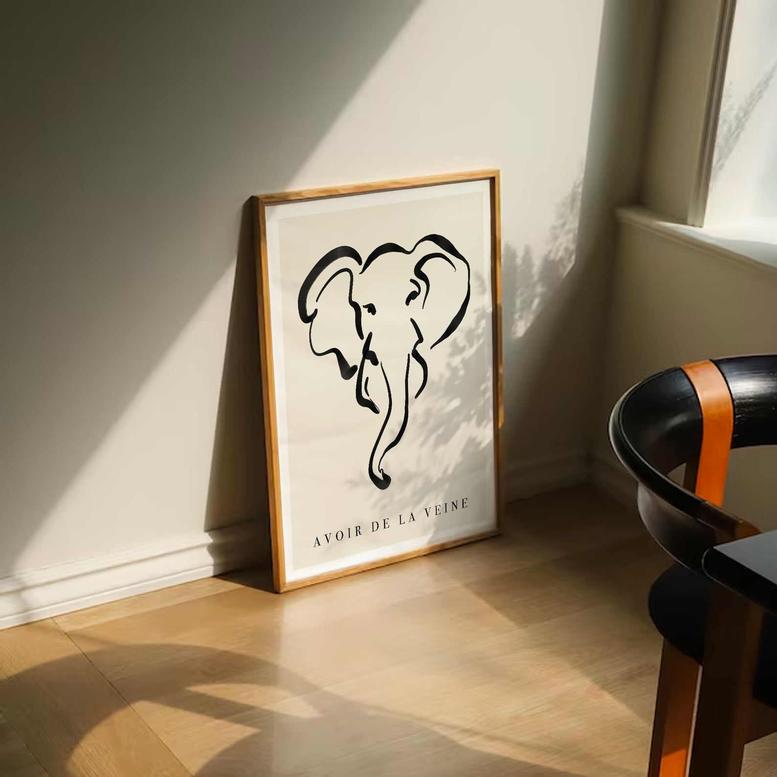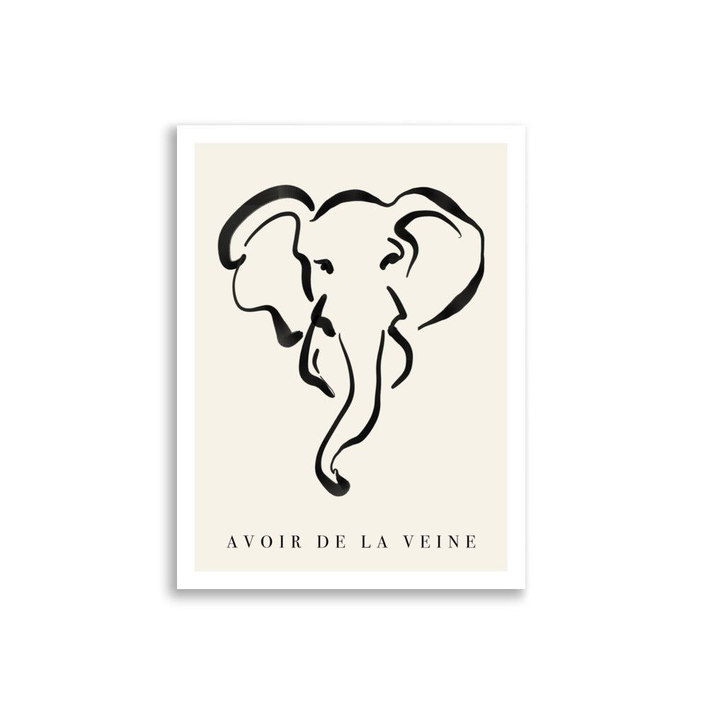 Simple minimalist painting of a lucky elephant, from the Avoir De La Veine ("Be Lucky") collection. This collection is all about manifesting luck and attracting abundance into the home. Elephants are associated with abundance, which is related to overall good fortune. Some cultures depict elephants with rain clouds, and this is a direct reference to them being connected to the bountiful harvests produced by farming communities. Be lucky my friends.