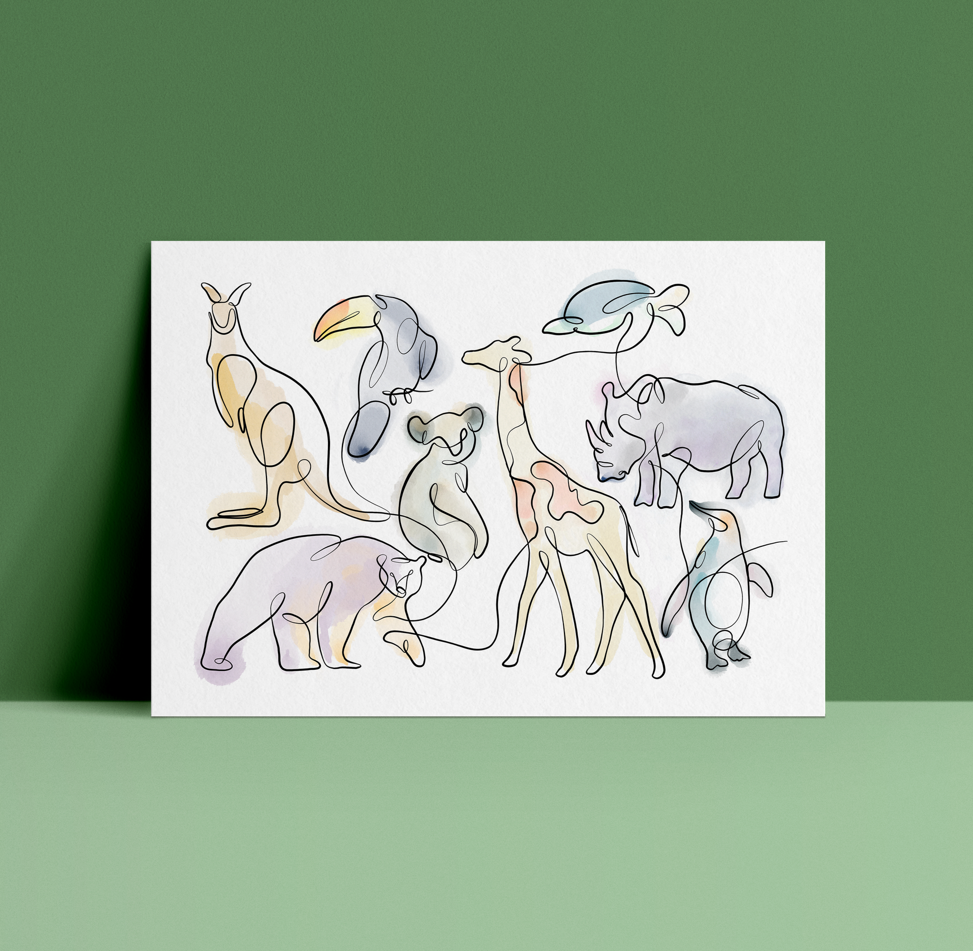This artwork features eight animals—penguin, rhino, turtle, giraffe, polar bear, koala, kangaroo, and toucan—all drawn in a single, continuous line without lifting the brush. The piece became popular via a TikTok challenge, where Hanna Lee Tidd attempted to paint all 8 animals in one single line without lifting her brush. (She did it). It's been digitised and brought to life with a splash of watercolour.
